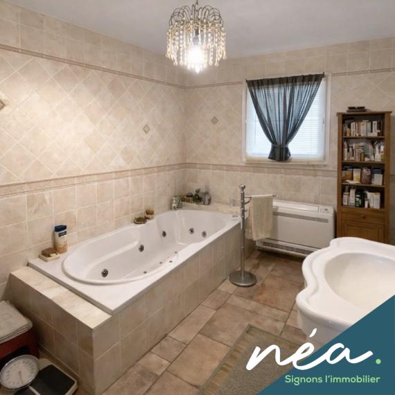 PLAIN-PIED : CUISINE EQUIPEE INTEGREE INDEPENDANTE - BELLE ET PROFITABLE PIECE DE VIE AVEC CLIMATISATION ET CHEMINEE FF - SUITE PARENTALE (Dressing - Sdb baignoire balnéo - douche) - WC - DEGAGEMENT